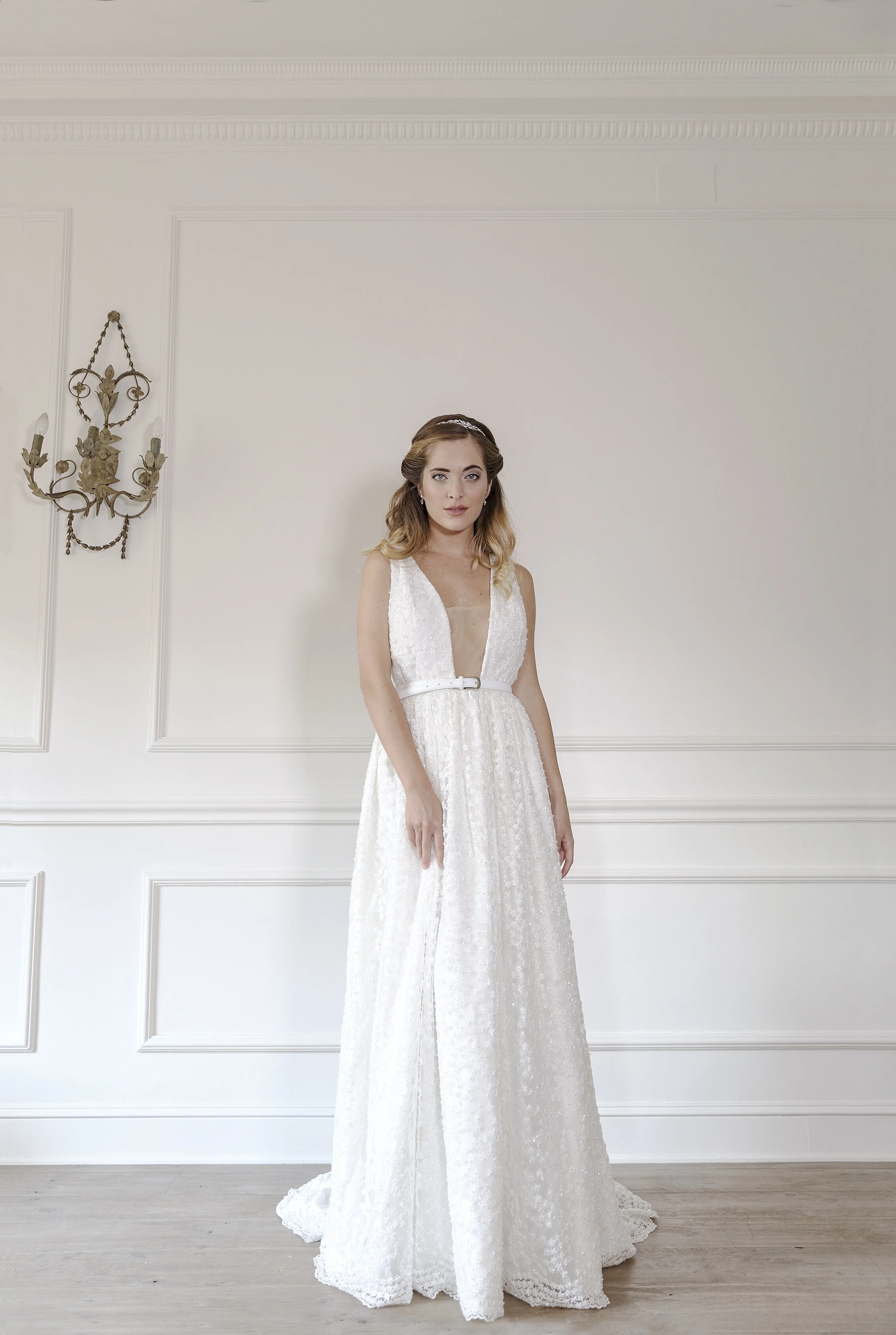 Diseño de corte sirena encorsetado, sexy y elegante. Combinando doble capa de georgette y encaje de hilo, cubriendo todas las costuras con bordados a mano. La silueta se realza con este patron, ciñendo el cuerpo hasta rodilla dando paso a una gran cola.